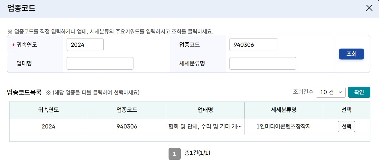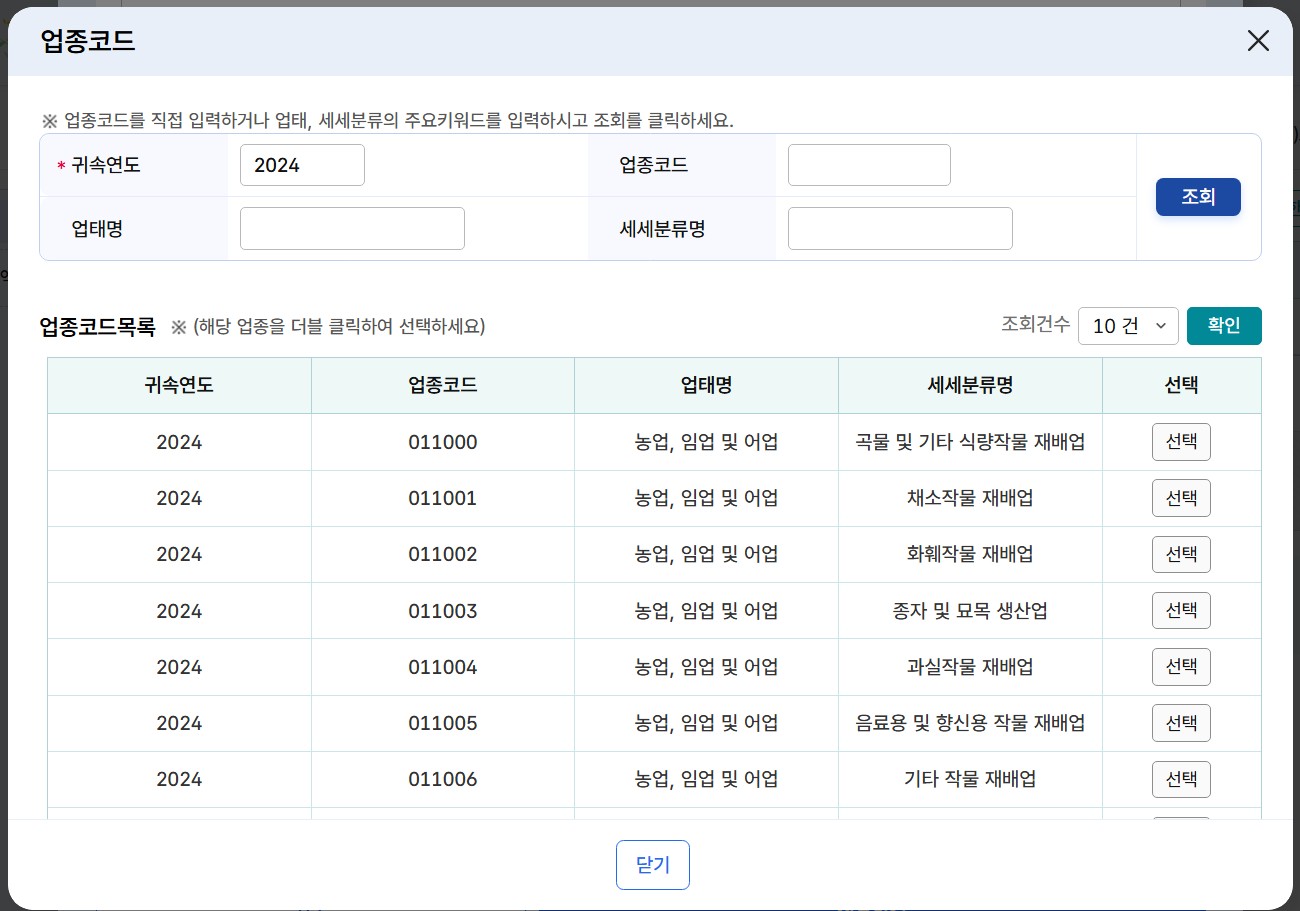 6-4. 아래 해당 업종코드가 뜨면 '선택'을 클릭합니다.