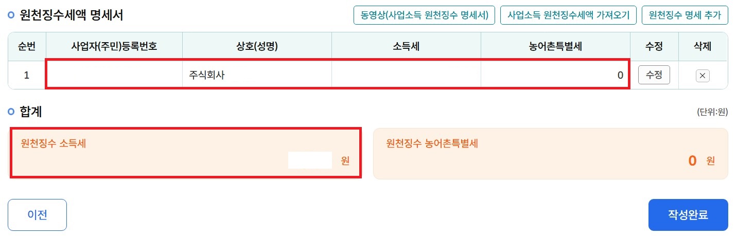저 같은 경우 위에서 업종코드 940909에 대한 사업소득 계산을 진행했었는데, 원천징수세액과 같은 거였어요. 처음엔 모르고 이대로 진행을 했었는데, 마지막 접수 단계에서 오류가 나더군요. 그래서 사업소득에서는 삭제하고 원천징수로만 넣었습니다.