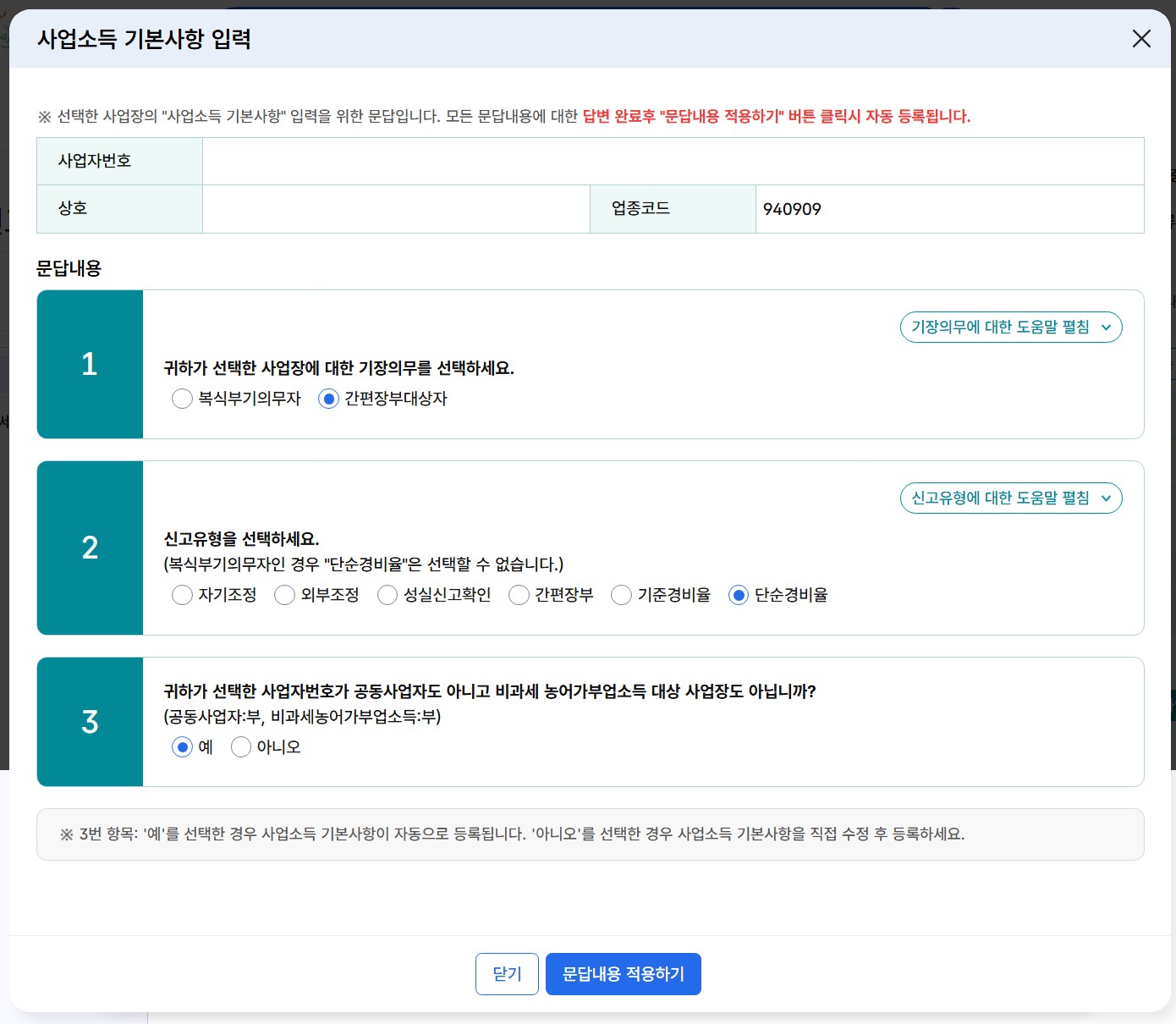 6-2. 세 가지 문답이 나오는데, 1번 기장의무는 '간편장부대상자', 2번 신고유형은 '단순경비율', 3번 공동사업자도 비과세 농어가부업소득 대상 사업자도 아니냐는 질문에는 '예'라고 답하고 '문답내용 적용하기'를 클릭합니다.