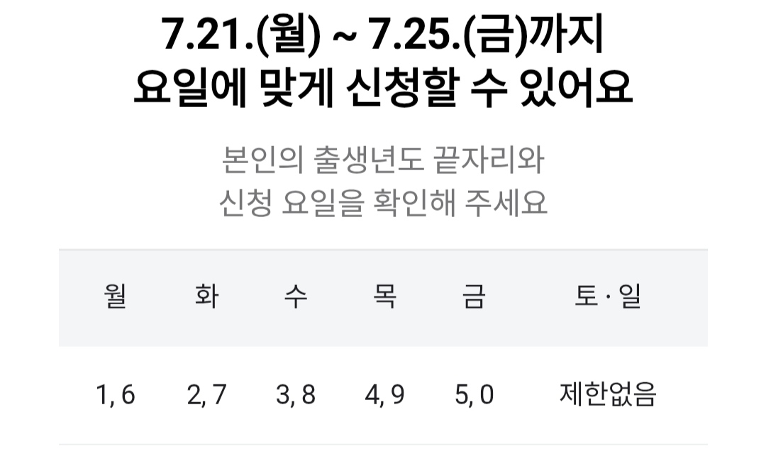 그리 26일 토요일과 27일 일요일에는 출생년도 끝자리 상관없이 미처 신청하지 못하신 분들 모두 신청하실 수 있습니다.