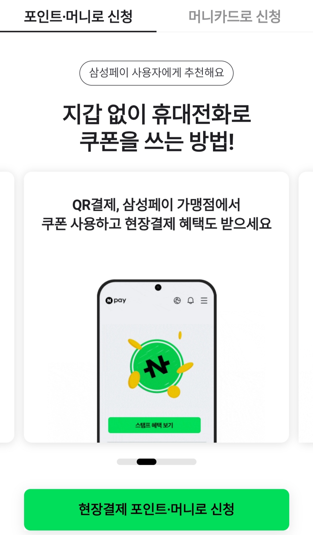 네이버페이는 포인트/머니 또는 머니카드로 신청하실 수 있는데, 네이버 현장 결제가 처음이시면 3천 포인트를 드리고 1천원은 모두에게 드려요. 단, 네이버페이 큐알 결제와 삼성페이 가맹점에서만 결제 가능한 점 유의해 주세요.