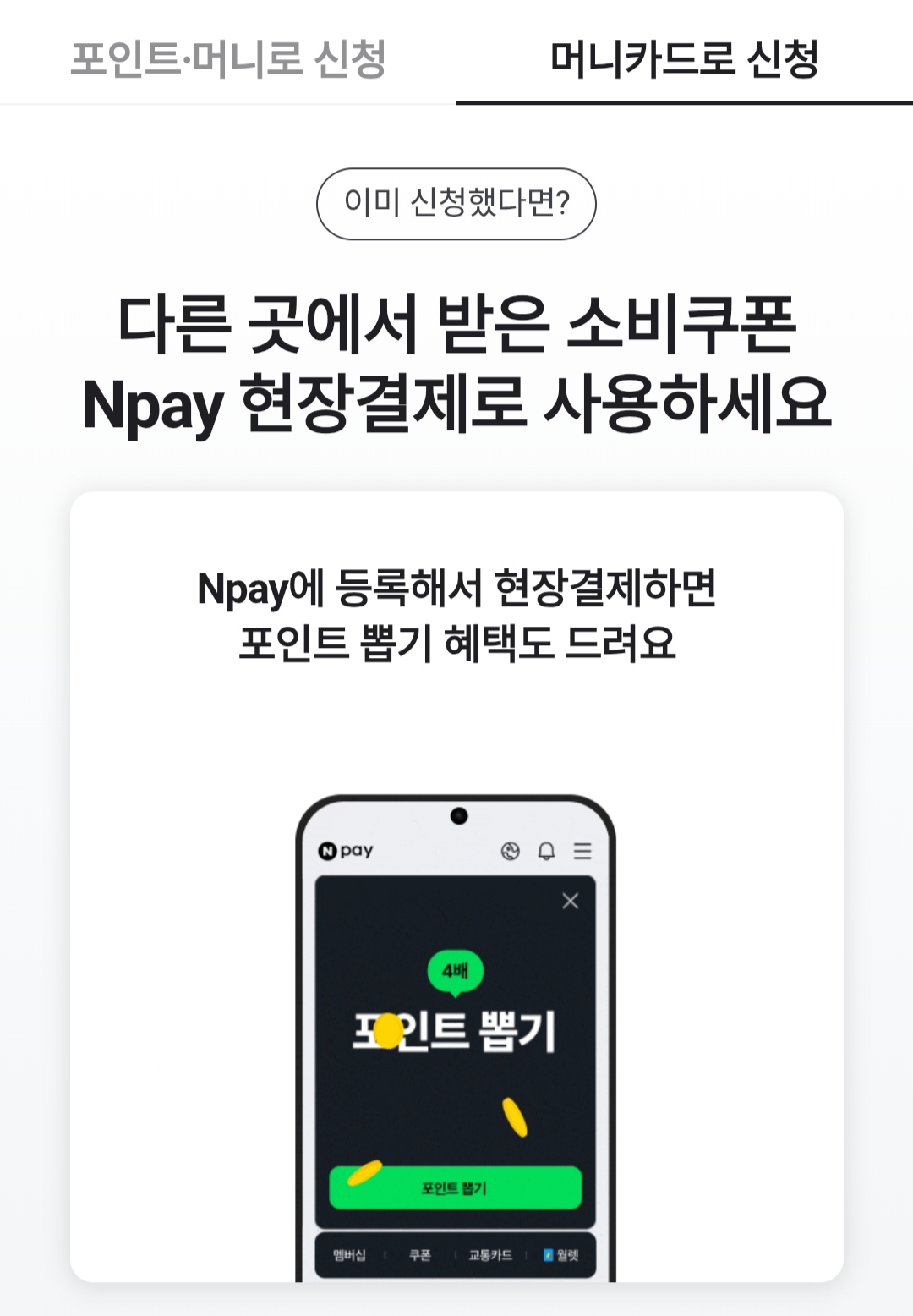 이미 다른 곳에서 받으셨다면, 네이버페이에 등록하셔서 현장 결제 시 사용하셔도 돼요.
