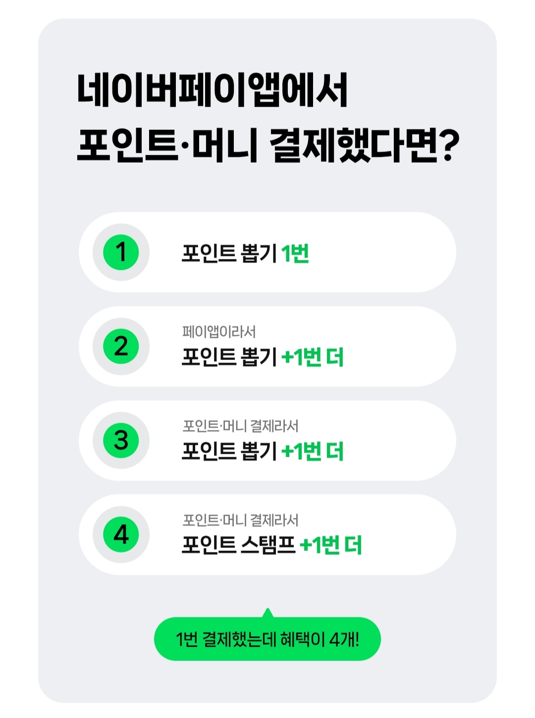 네이버페이로 현장 결제를 하시면 포인트 뽑기 혜택을 드리는데, 포인트/머니로 하시면 3번째, 5번째, 10번째마다 랜덤 포인트를 더 드리고, 네이버페이 앱을 통해 결제하시면 최대 4번 뽑기의 기회를 드려요.(단, 소액 당첨 주의!! 큰 기대는 금물~~^^;)